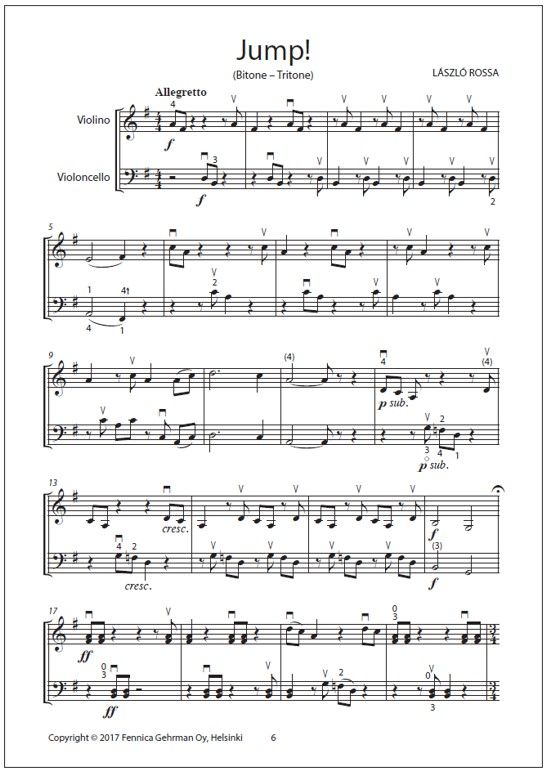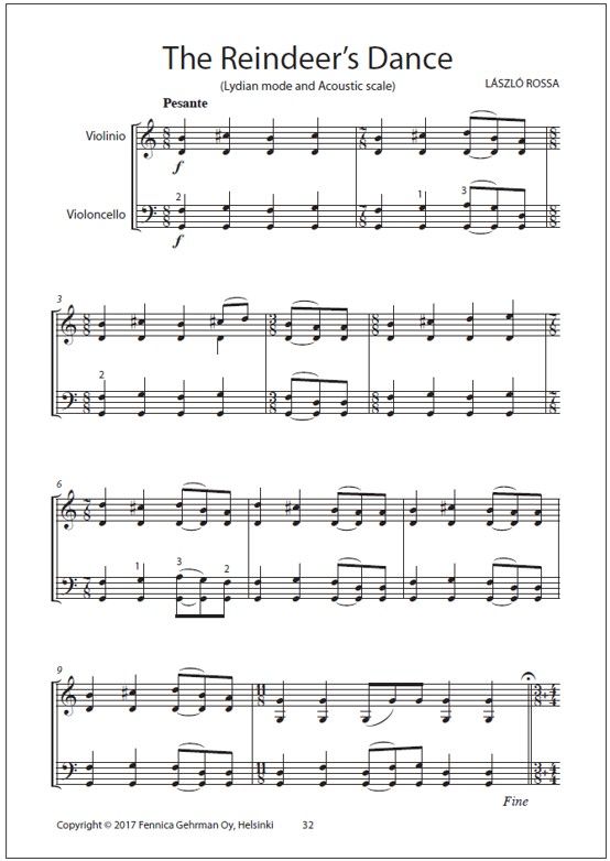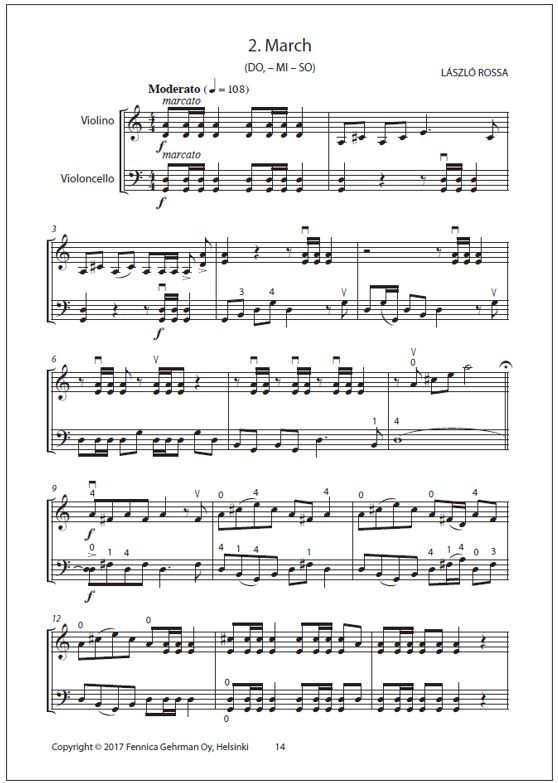 Duos for Violin and Cello Vol. 1 include 21 folk song inspired compositions by László Rossa. Different modes are explored, as are keys, meters and double-stops. The book starts with 2-note children's songs and through 3-, 4- and 5-note melodies it builds up to the heptachord scale.