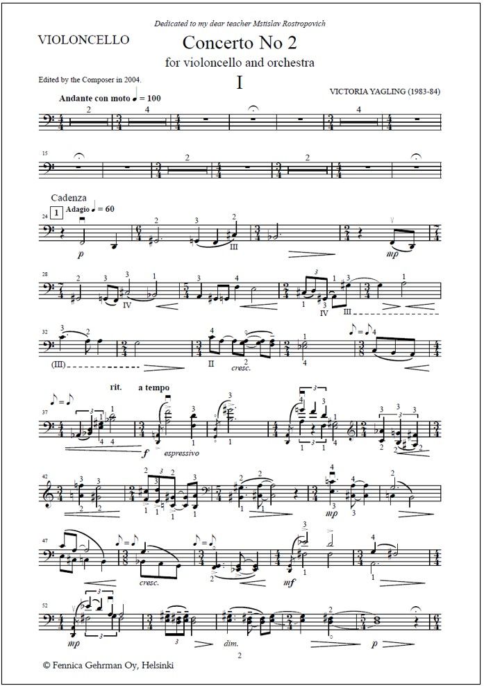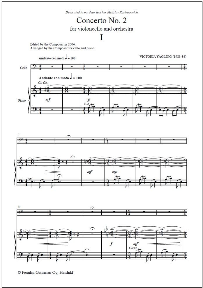 Yagling left a profilic oeuvre, and the three cello concertos are her main works. Her other orchestral works include Finnish Notebook, Lyrical Preludes and the Suite for Cello and String Orchestra. She has also composed solo works (e.g. the Suite for Cello Solo No. 1 chosen as an obligatory piece for the 7th Tchaikovsky Competition in Moscow in 1982), chamber works, including two string quartets, and vocal music. Her expressive, romantically orientated style is Russian in spirit and has grown out of the soil provided by Prokofiev and Shostakovich. Concerto No. 2 for violoncello and orchestra (1983−84) is dedicated to Mstislav Rostropovich. The composer edited the piano reduction in 2004. As a cellist who possessed an exceptional knowledge of her instrument, she carefully marked in her scores all the smallest instrumental details, fingerings included. The duration of the concerto is c. 22 minutes.