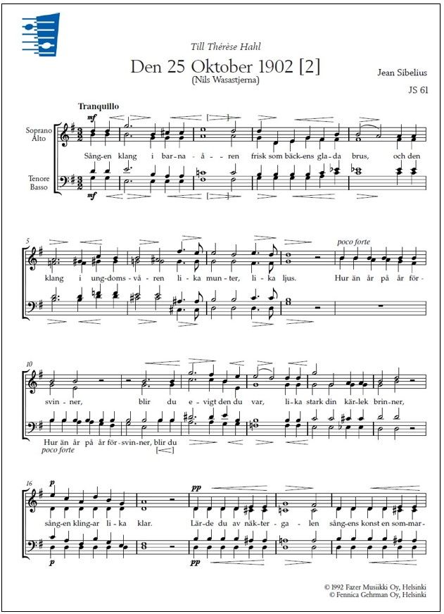 Sibelius composed Den 25 Oktober 1902 for mixed choir as a birthday gift to a friend, Thérèse Hahl (1842-1911) who enjoyed a position of high esteem in Helsinki concert life and was a sought-after oratorio soloist. There are two different settings to the same text in Swedish by Nils Wasastjerna, both included in this publication, which is and is based on the complete critical edition "Jean Sibelius Works "(JSW).