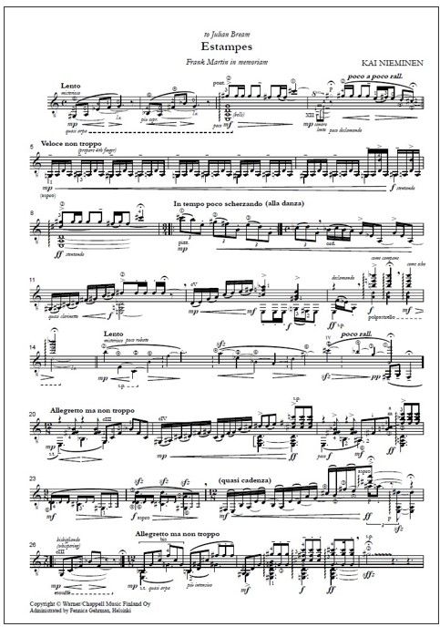 Downloadable PDF edition. Kai Nieminen has an intense awareness of colours, and the possibilities of expressing these on the classical guitar, an instrument on which he is himself a fine performer. Estampes - Frank Martin in Memoriam demands a more orchestral approach from the performer. Although the mood is for the most part serious, it is not without humour. This work can be played together with The Temple, another guitar work by Nieminen.