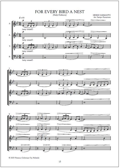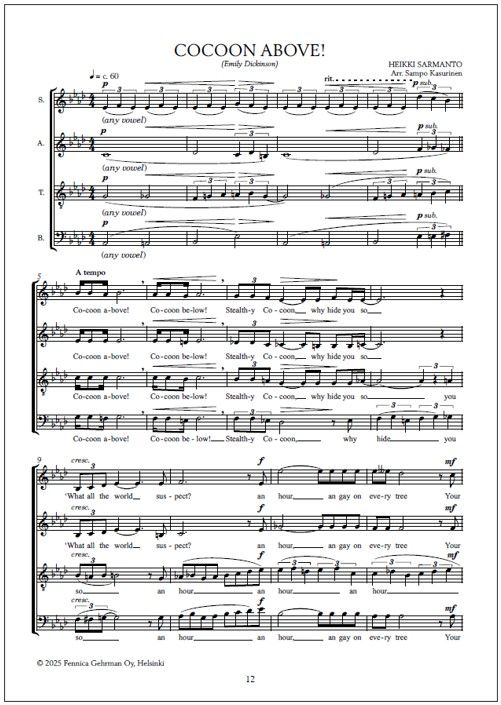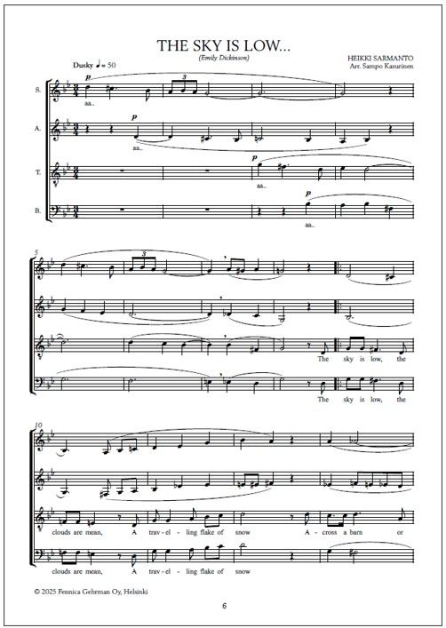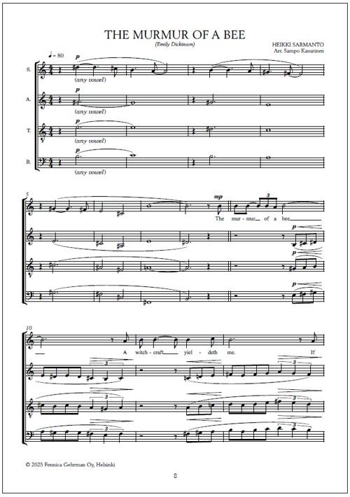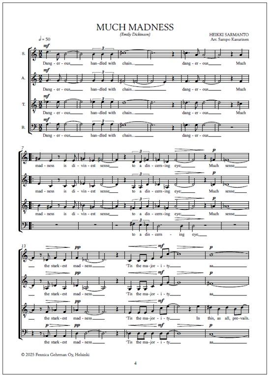 A pioneer of Finnish modern jazz, Heikki Sarmanto (1939-) has composed powerful and moving poems by Emily Dickinson (1830-1886), now available as compelling arrangements for mixed choir by Sampo Kasurinen.