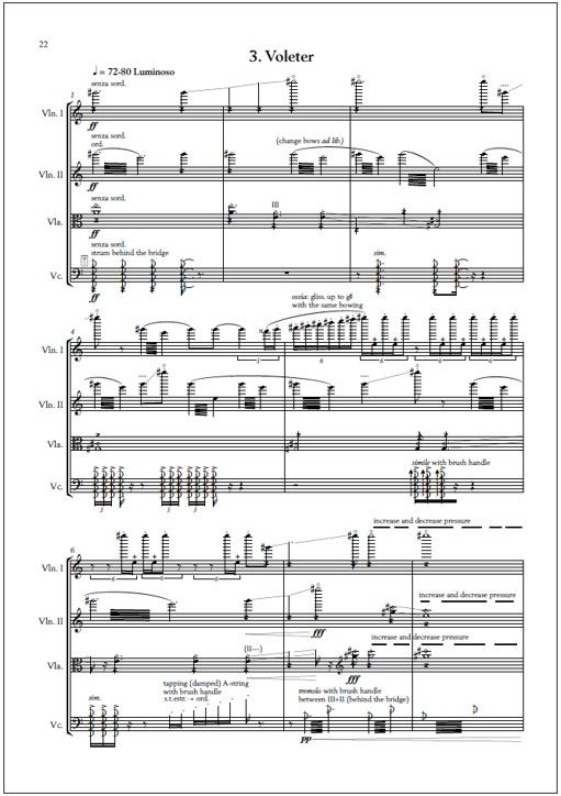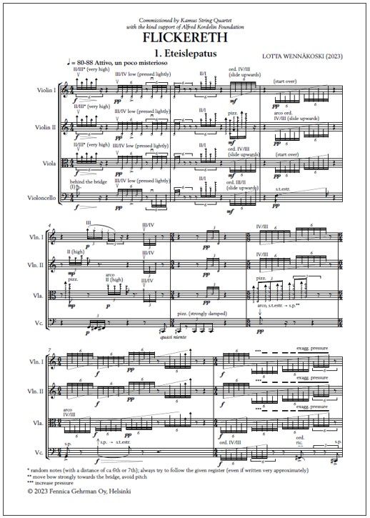 Flickereth is Lotta Wennäkoski's third work for string quartet. The composer tells: "The idea behind Flickereth is, quite simply, flickering - be it of a light, a flame or fluttering butterfly wings. In addition to strings, I wanted to extend my flickering with such everyday objects as slide-like metal mugs, pastry brushes and cotton sticks. (I should add that with regard to these, I was determined to avoid any humorous associations.)"