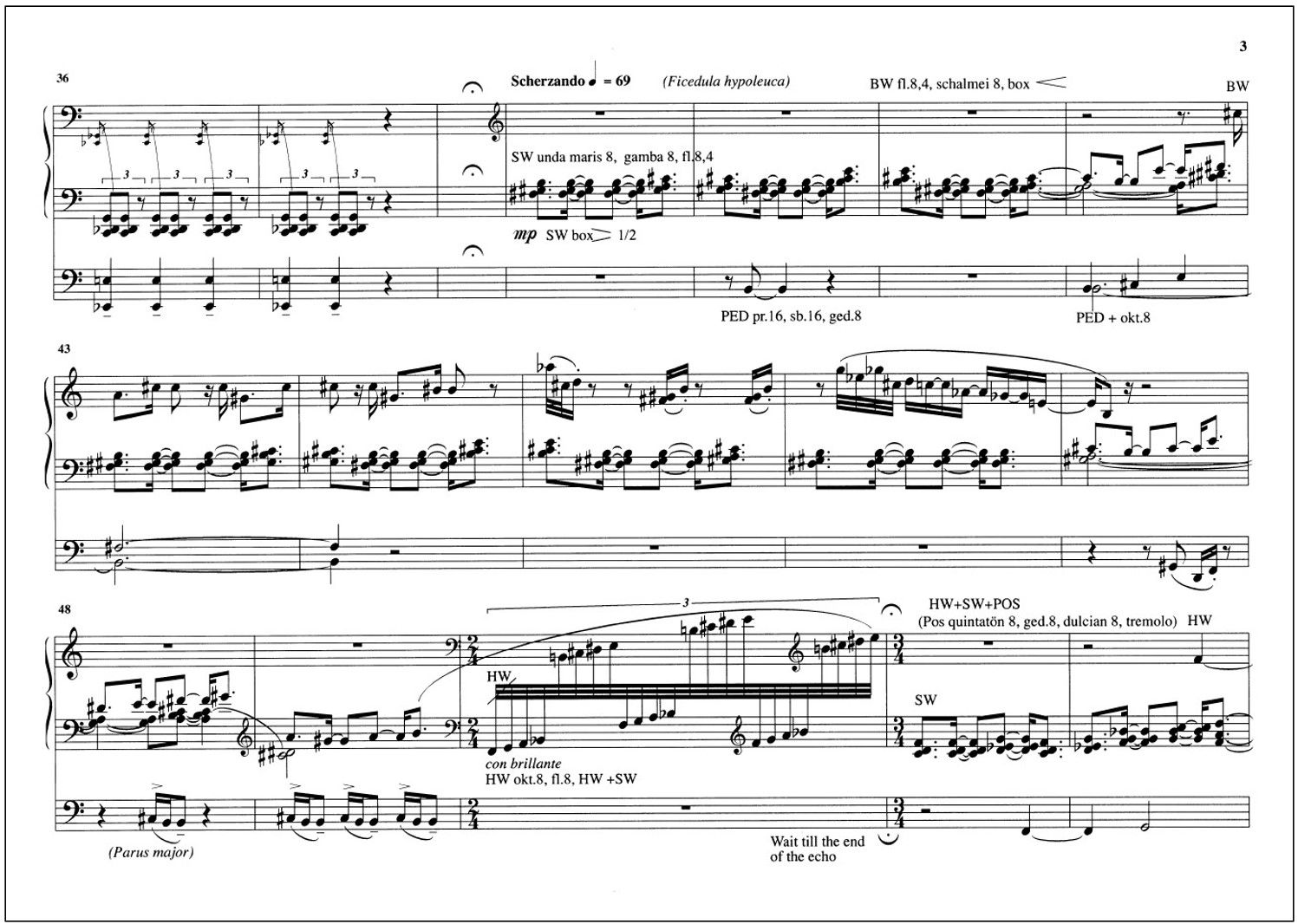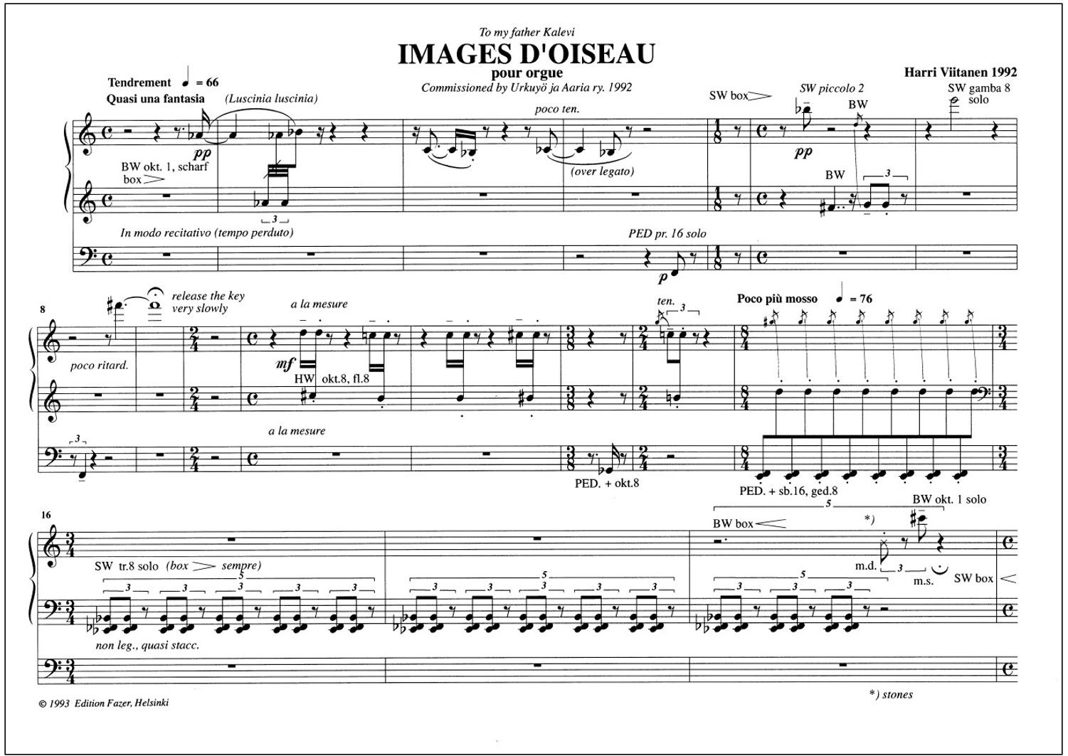 Harri Viitanen's three passions are the organ, nature and the stars, and he combines the first two of these in Images d'oiseaux. The birdsongs which function as an important element in the work were studied from recordings made in the vicinity of Viitanen's home: they are the nightingale, pied fly-catcher, blackbird and great tit. The work is written for a three or four-manual instrument with the addition of two clicking stones which contribute to the birdsong effects.