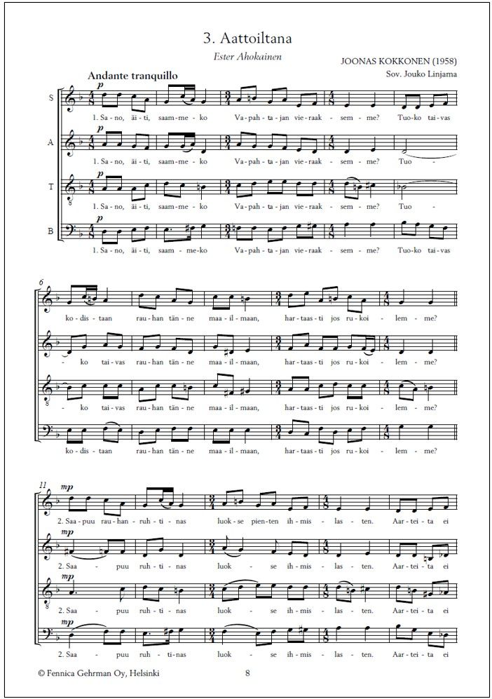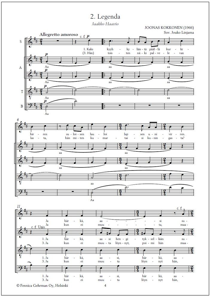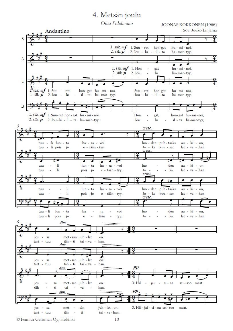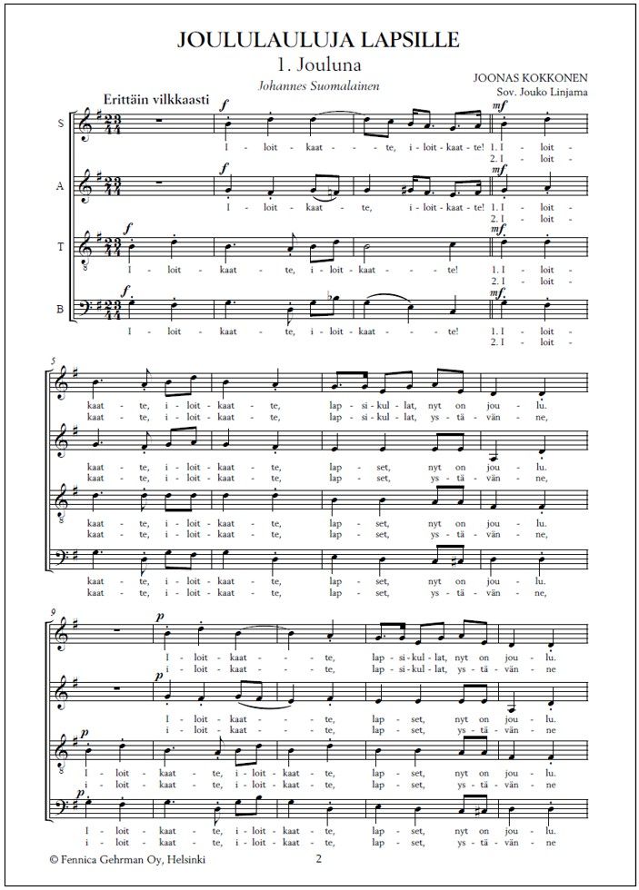 Ihastuttava Joonas Kokkosen joululaulusarja nyt vihdoin saatavilla myös sekakuorosovituksena. Neljän laulun kokoelma sisältää osat Jouluna (teksti Johannes Suomalainen), Legenda (Jaakko Haavio), Aattoiltana (Ester Ahokainen) ja Metsän joulu (Oiva Paloheimo). Sovituksen sekakuorolle on tehnyt Kokkosen oppilas, säveltäjä Jouko Linjama (s. 1934).