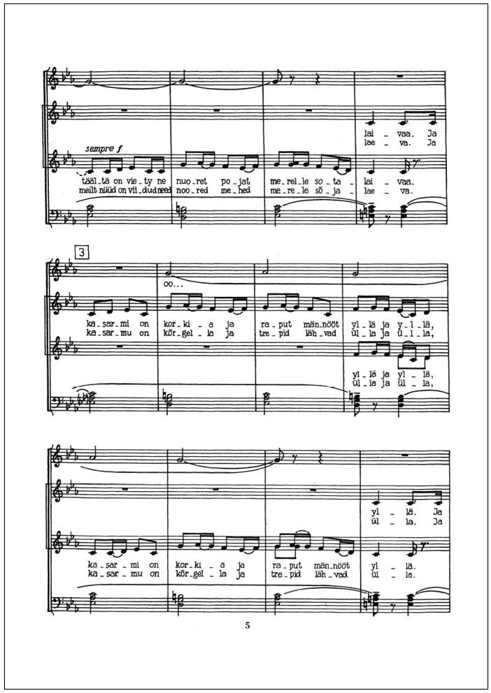 Laevas lauldakse (Singing Aboard Ship) is an Ingrian-Finnish folk song and ballad. In this hypnotic love song we hear tragic overtones which are connected with historical circumstances: young men in the small village of Rappula were taken to do military servie, while girls stayed behing, weeping on the shore. The original form of the song has been fully preserved. It represents the alteration of a lead singer and chorus, typical of Balto-Finnic folk songs. Tormis has, however, added a suitable background - emotional commentaries and dramatical dynamics.