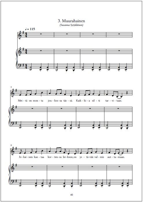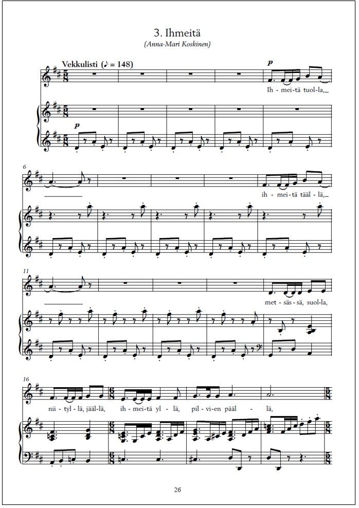 | Authors: | Borys, Szymon (Composer) Honkavirta, Lauri (Composer) Hynninen, Laura (Composer) Järvi, Elisa (Composer) Liukkonen, Mari (Composer) Mäenpää, Roope (Composer) Nikkinen, Auri-Helena (Composer) Puukko, Pauliina (Composer) Ranta-aho, Eetu (Composer) Salmenkangas, Janne (Composer) Soininen, Antti (Composer) Syrjäläinen, Susanna (Composer) Eskelinen, Marjukka (Preface by) Strandman, Saara-Maija (Preface by) |