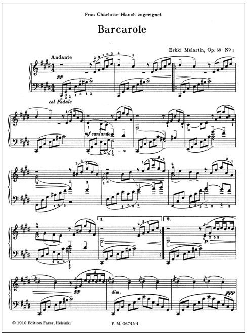Viisi pianokappaletta/Five pieces for piano: Barcarole, Romance, Berceuse, Intermezzo & Impromptu.