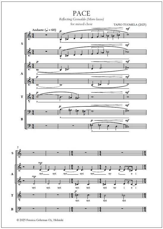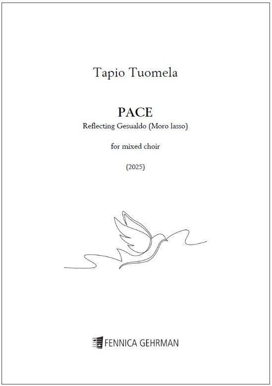 Tapio Tuomela's (b. 1958) Pace for mixed choir (SSAATTBB, 2025) is an appeal for peace, inspired by the enigmatic opening of Carlo Gesualdo's madrigal "Moro, lasso" (1611). A fragment of the Gospel of John is heard recited in the local language of the performance: "Peace I leave with you. My peace I give to you [...]" Rhythmically accelerating chromatic outbreaks culminate the work.