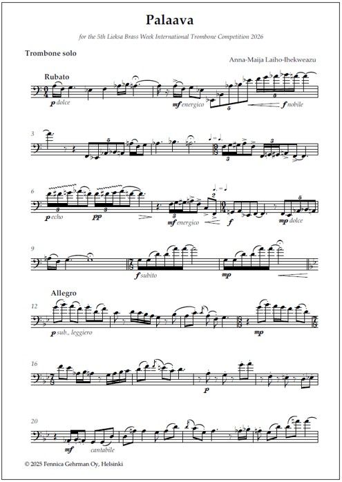 Anna-Maija Laiho-Ihekweazu's Palaava (2025) is Finnish for ”The returning one”. It was composed for the 5th Lieksa Brass Week International Trombone Competition 2026. It describes a person recovering from a difficult phase and returning to live life. "Palaava" also drafts the complex pattern of feelings from euphoria to contemplation that one can experience while returning to a familiar scenery. There is thematical returning in Palaava as well.