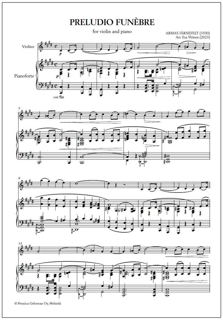Armas Järnefelt composed Preludio funèbre for orchestra in April 1930 for the funerals of Sweden's queen Victoria. Esa Ylönen made this arrangement for violin and piano in 2023.