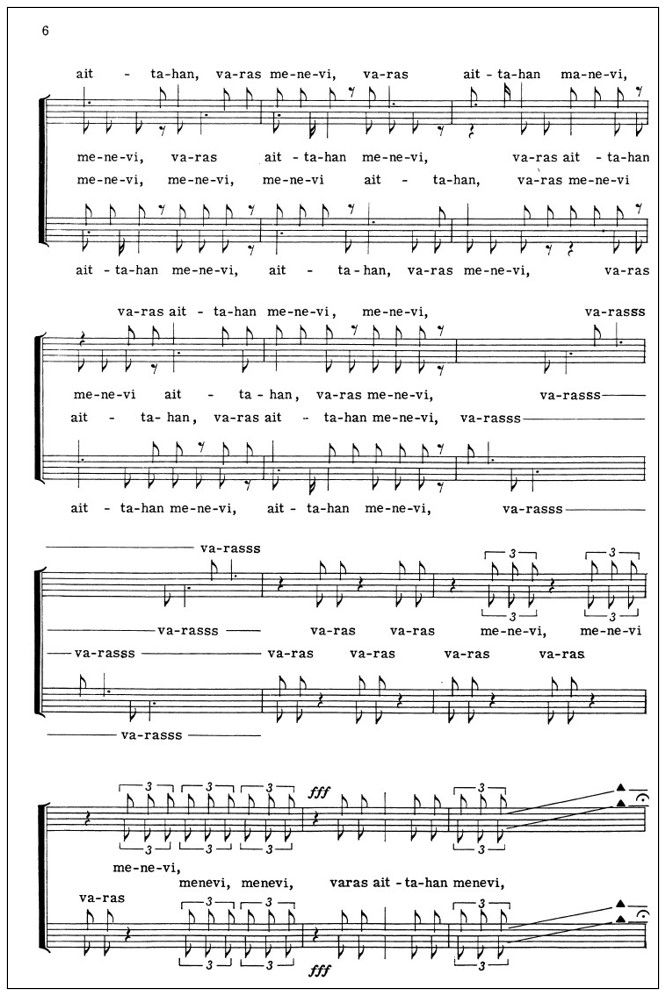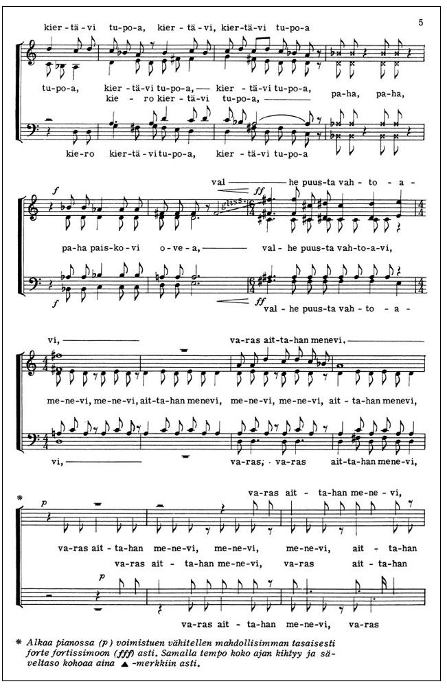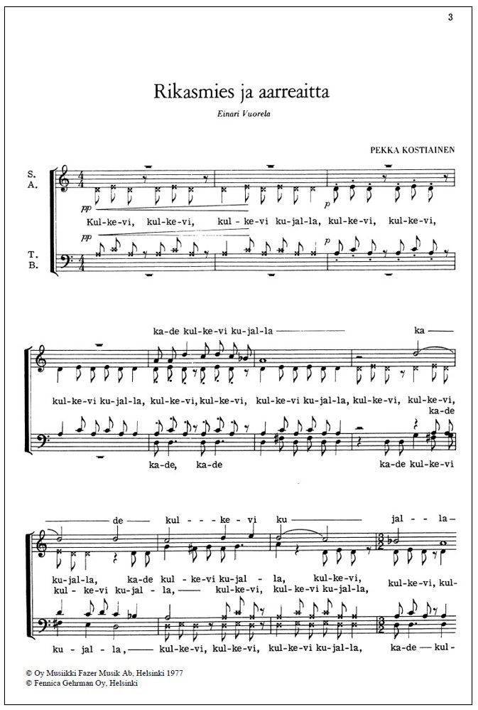 Rikasmies ja aarreaitta (The Rich Man and the Treasury, 1975) was commissioned by the Jyväskylä Studio Choir. The text by Einari Vuorela describes a rich man who suspects that a burglar is going to steal his treasures. When he finally rushes out in rage, he finds a little mouse scampering in his moonlit yard.