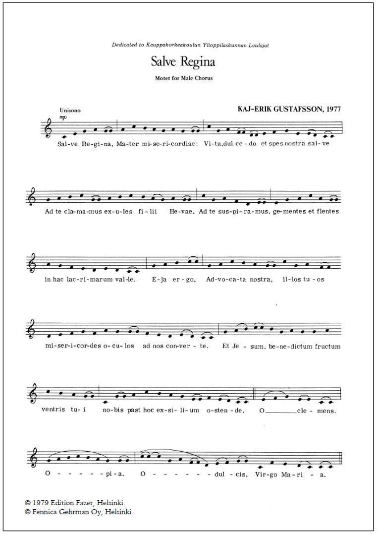 Kaj-Erik Gustafsson is a Finnish organist and choral conductor who has also written vocal and organ works. His motet Salve Regina (1977) begins with a plainchant introduction. This then becomes the subject for variation in a style which pays homage to the melody's archaic origins. Text: Bible (Latin), duration 10 minutes. Published in the Chorus series (Ch 65).