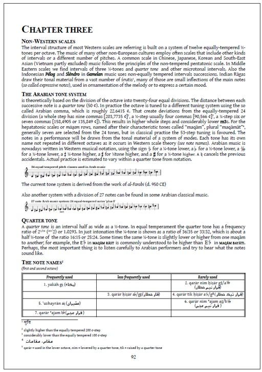 Chapter 3 presents non-western scales: the Arab tone system, the music of Persia/Iran, the Turkish musical system, the Indian musical systems, Japan, China, and many more. Chapter 4 presents microtonal systems.