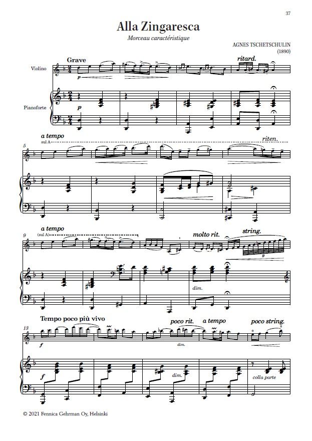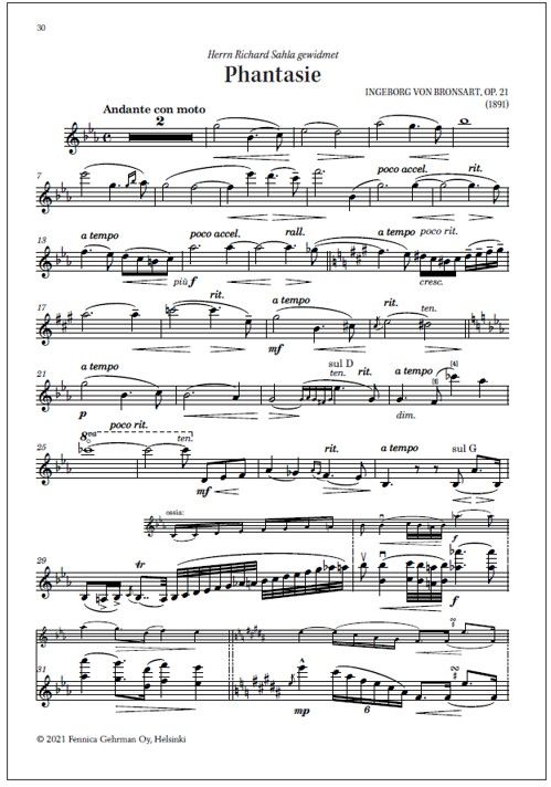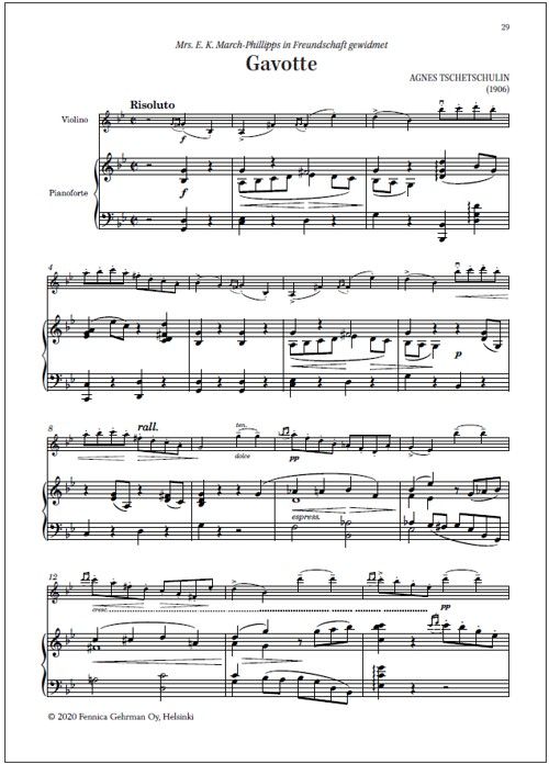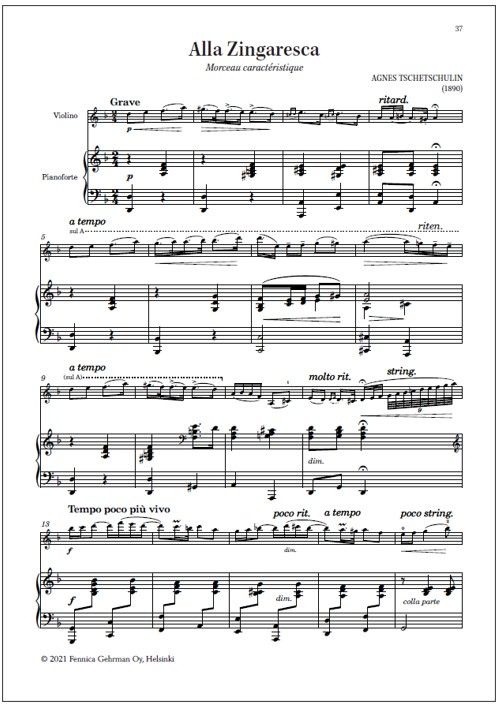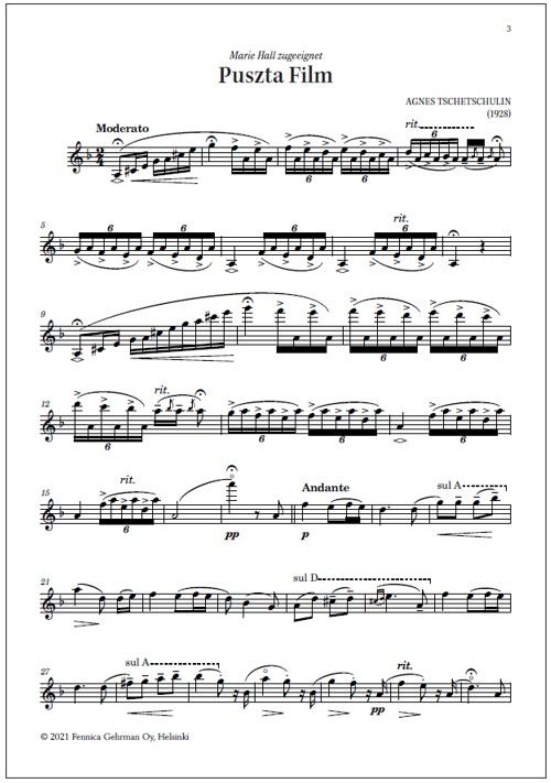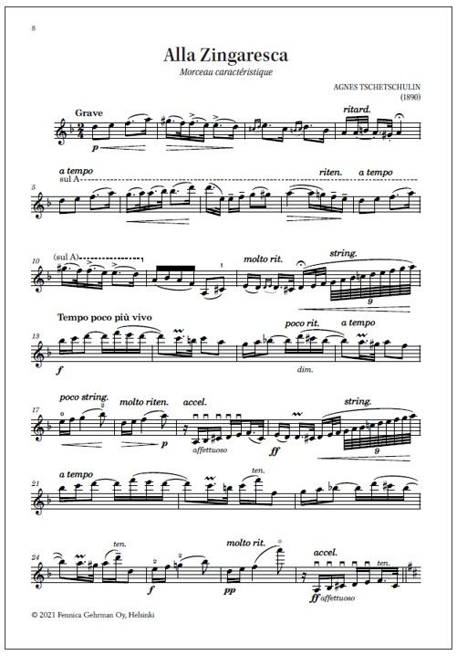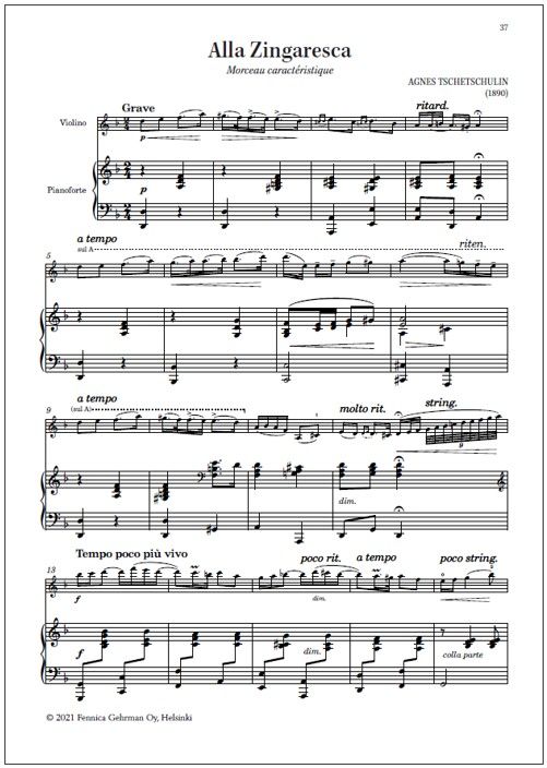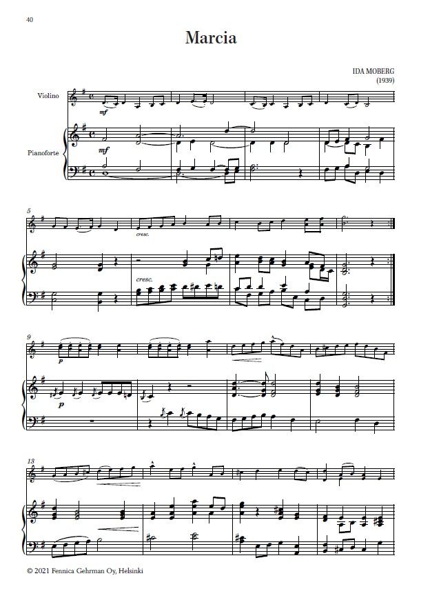 Other Finnish works for violin contains twelve pieces for violin and piano. Though brief in duration, most of them were written for concert use, being rich and expressive and, in some cases, technically quite demanding. Others are delightful salon pieces. This volume was compiled by violinist Mirka Malmi and edited by her with pianist Tiina Karakorpi.