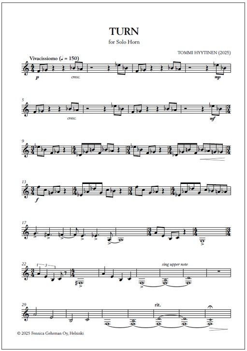 The title "Turn" of Tommi Hyytinen's work for solo horn (2025) refers to the numerous rhythmic turns it contains. Following an intense rhythmic playfulness at the beginning, the piece evolves into an expressive modal melody. After this, the initial rhythmic motifs return with even greater force, gradually calming towards the end.