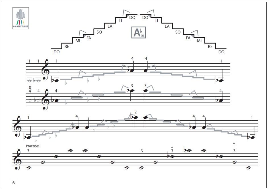 To facilitate the learning, each page will introduce only one new note. The initial tone of each scale is properly printed; the places of other tones are illustrated with a diagram. This helps the child to concentrate on the learning and writing of the new note and its locating on the fingerboard.