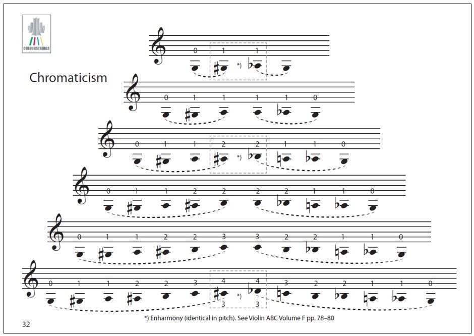 Colourstrings Violin ABC Books E (9790550095434) and F (9790550095441) have relevant chapters about finger patterns and enharmony and our recommended to use alongside with the Violin Scales 2.
