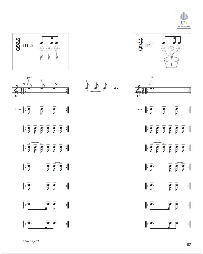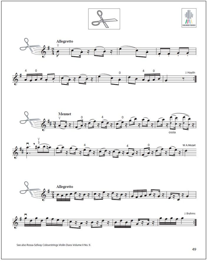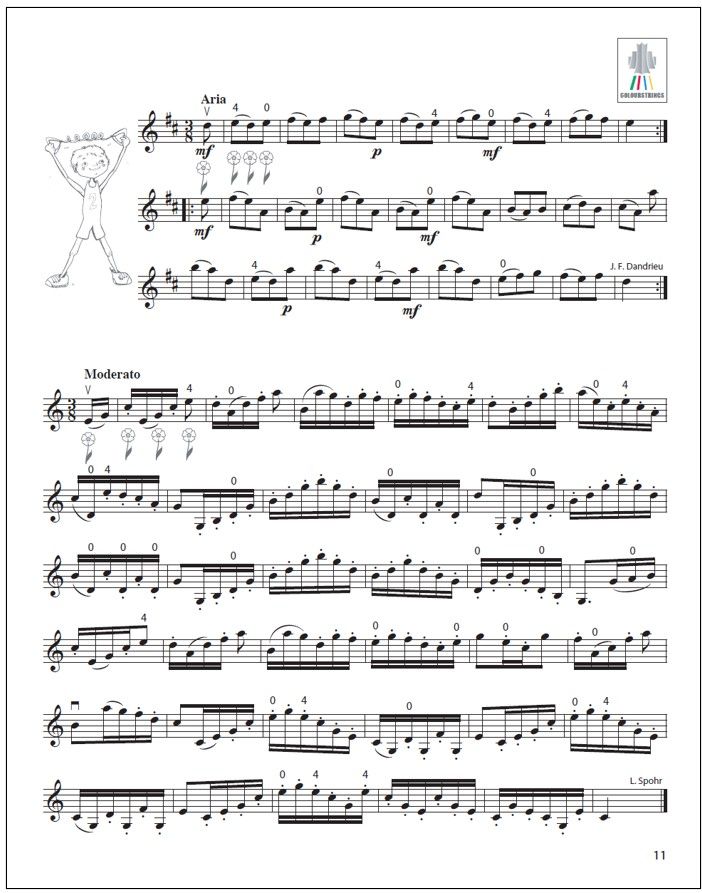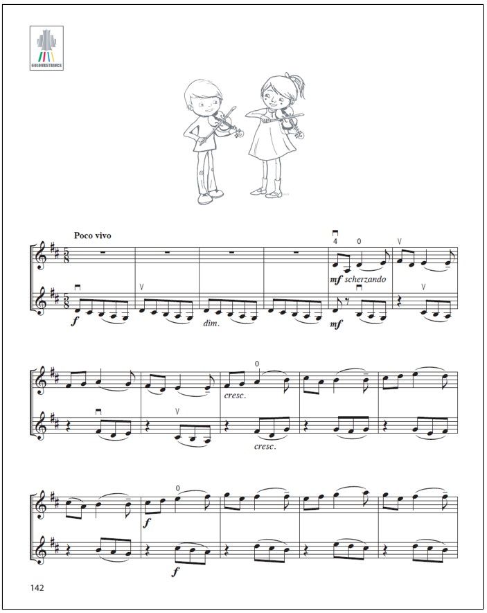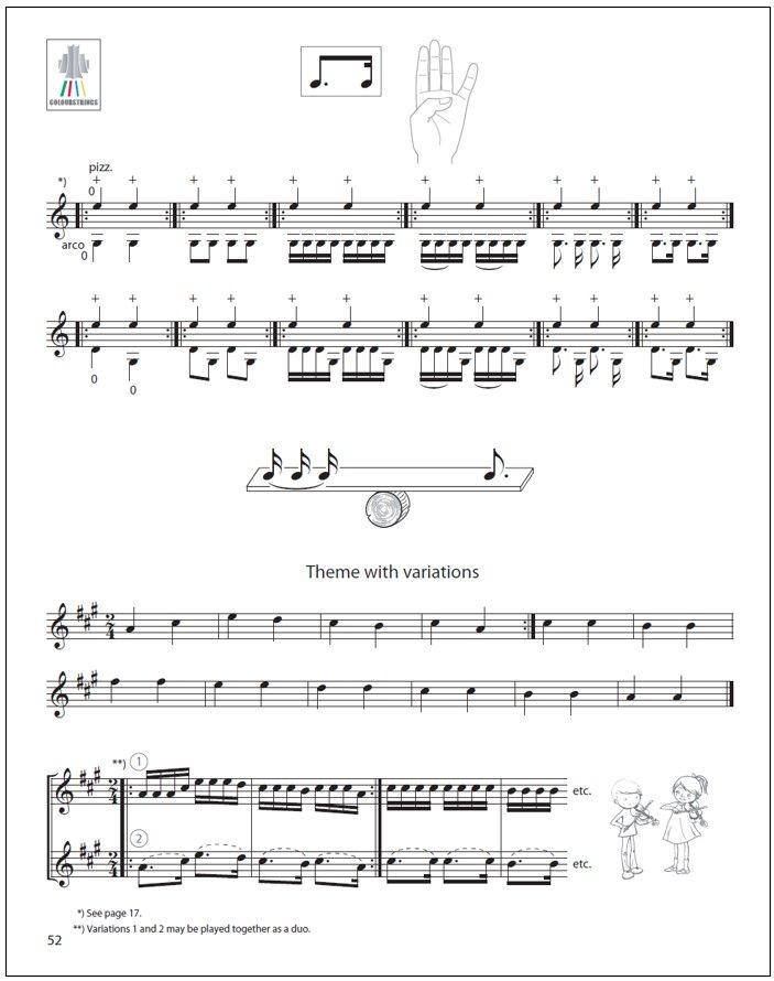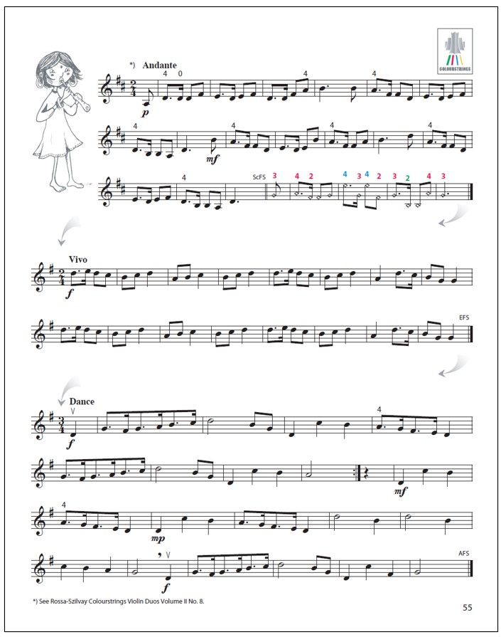 In order to achieve this, the Yellow Pages provide a large variety of pedagogical material on each subject, from which the teacher can select the most appropriate material to meet the needs of each individual student. All new concepts are introduced in first position, using only the most comfortable finger patterns. This simplicity of the left hand enables the child and the teacher to concentrate on the movements of the bow hand. The teacher is nevertheless invited to add more demanding fingerings to encourage position work if it is appropriate for the student. Volumes E (9790550095434) and F (9790550095441) of the Colourstrings Violin ABC focus on the development of left hand technique, whereas the Yellow Pages focuses on the movements of the bow. It is therefore advisable for teachers to use the Yellow Pages at the same time as Volumes E and F.
