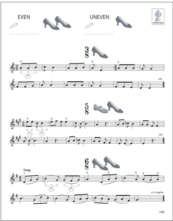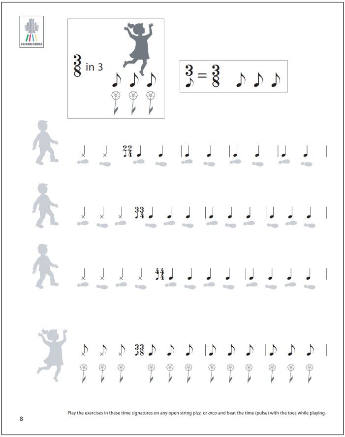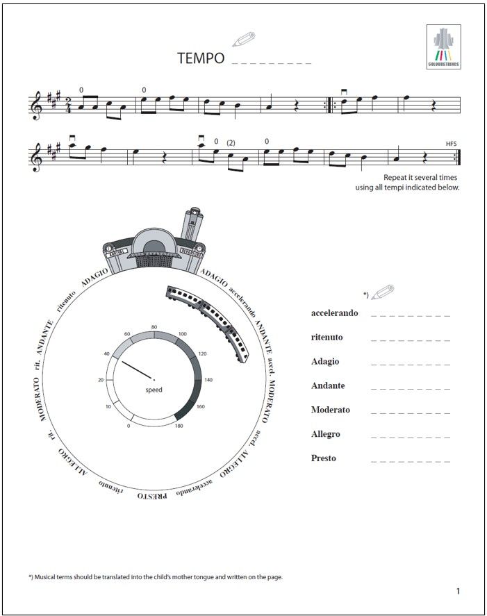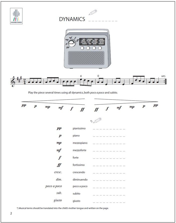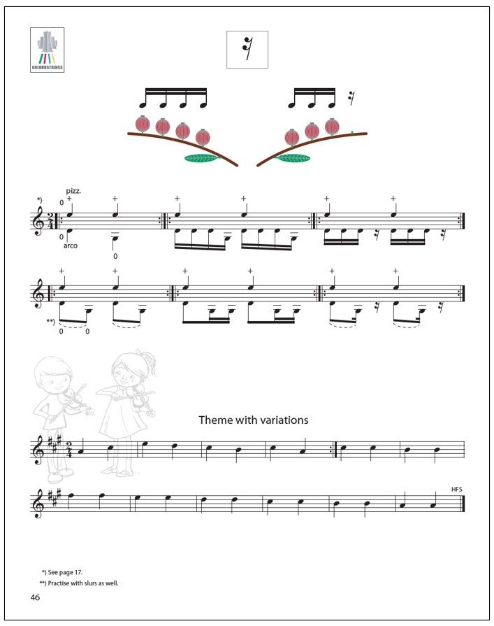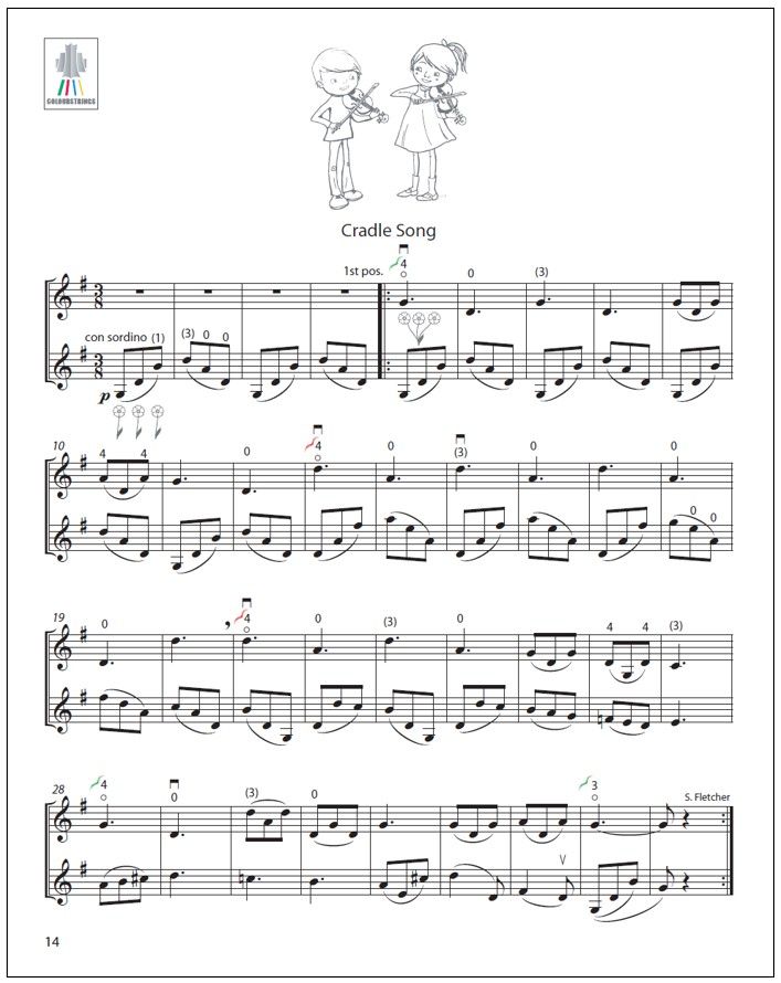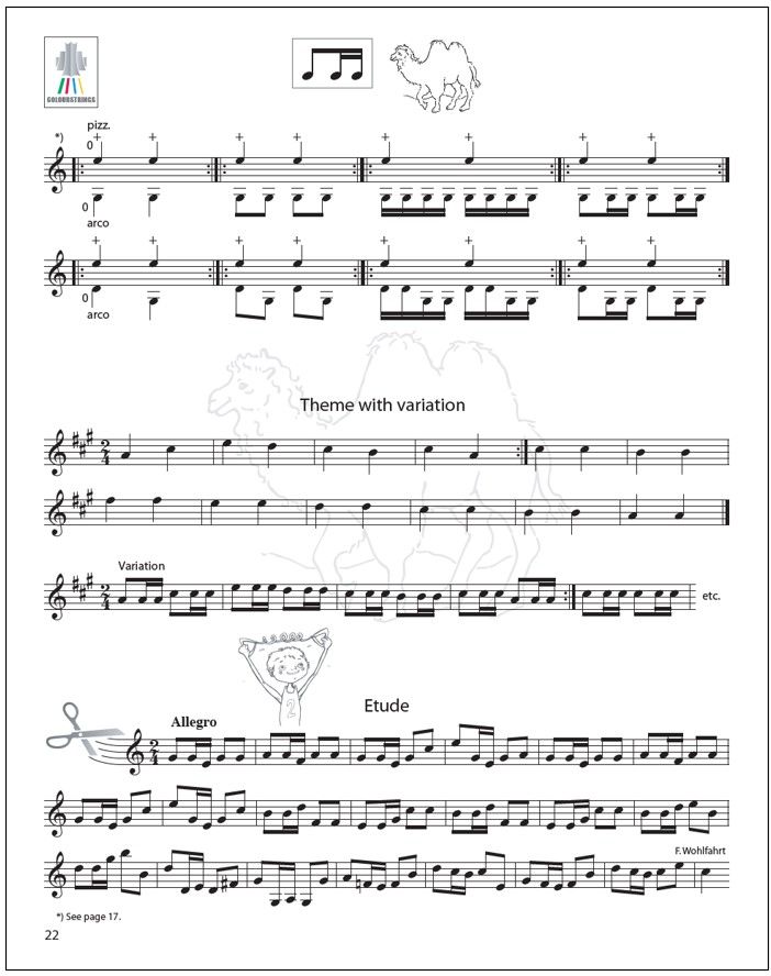 In order to achieve this, the Yellow Pages provide a large variety of pedagogical material on each subject, from which the teacher can select the most appropriate material to meet the needs of each individual student. All new concepts are introduced in first position, using only the most comfortable finger patterns. This simplicity of the left hand enables the child and the teacher to concentrate on the movements of the bow hand. The teacher is nevertheless invited to add more demanding fingerings to encourage position work if it is appropriate for the student. Volumes E (9790550095434) and F (9790550095441) of the Colourstrings Violin ABC focus on the development of left hand technique, whereas the Yellow Pages focuses on the movements of the bow. It is therefore advisable for teachers to use the Yellow Pages at the same time as Volumes E and F.