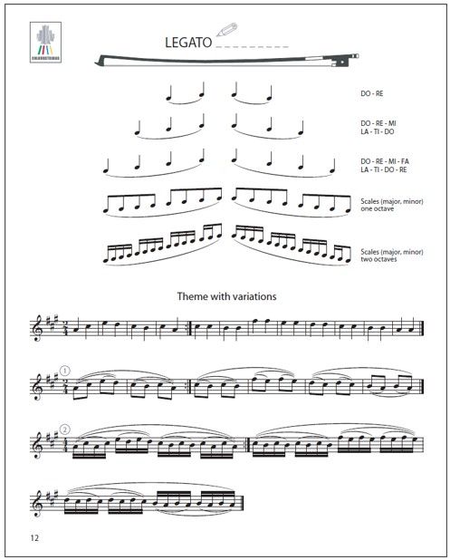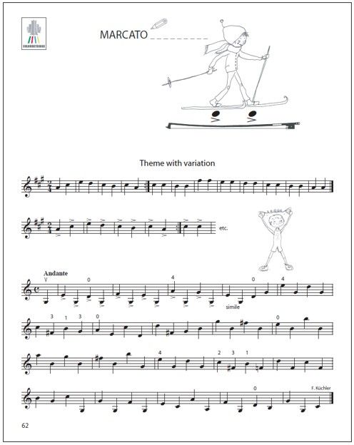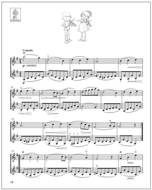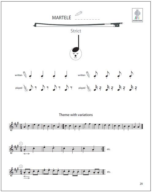 In order to achieve this, the Yellow Pages provide a large variety of pedagogical material on each subject, from which the teacher can select the most appropriate material to meet the needs of each individual student. All new concepts are introduced in first position, using only the most comfortable finger patterns. This simplicity of the left hand enables the child and the teacher to concentrate on the movements of the bow hand. The teacher is nevertheless invited to add more demanding fingerings to encourage position work if it is appropriate for the student. Volumes E (9790550095434) and F (9790550095441) of the Colourstrings Violin ABC focus on the development of left hand technique, whereas the Yellow Pages focuses on the movements of the bow. It is therefore advisable for teachers to use the Yellow Pages at the same time as Volumes E and F.